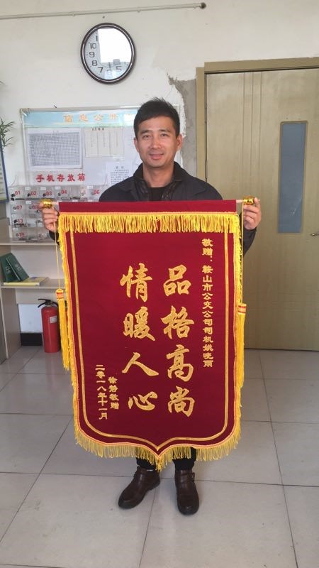 1、2018年11月16日,來了一名叫徐靜女士拿著一面錦旗來到了客運十一隊35路快線調(diào)度室,向4110819號車駕駛員姚曉宇師傅拾金不昧的行為表示感謝。11月2日下午16點50分,她乘坐35路快時將一藍色布袋(內(nèi)有公章及各種證件)遺落在車上,隨后被駕駛員姚曉雨拾到,及時聯(lián)系失主并歸還。